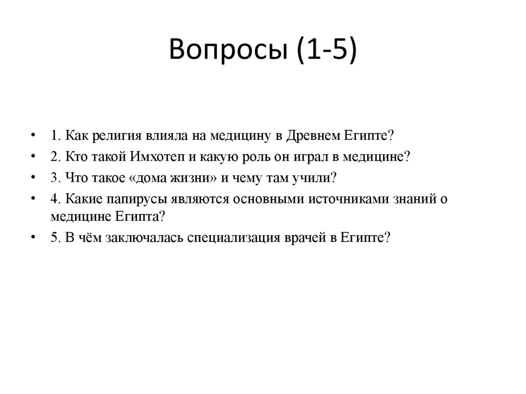 Вопросы (1-5)1. Как религия влияла на медицину в Древнем Египте?
