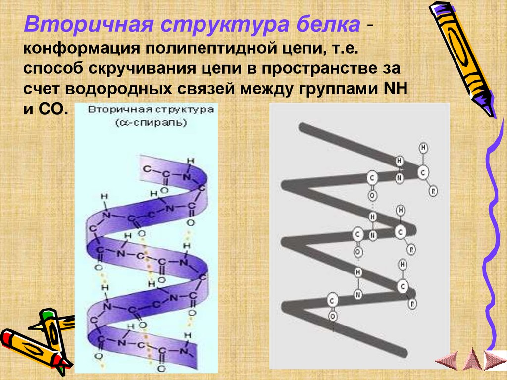 Вторичная структура белка конформация полипептидной цепи, т.е.способ скручивания цепи в пространстве за