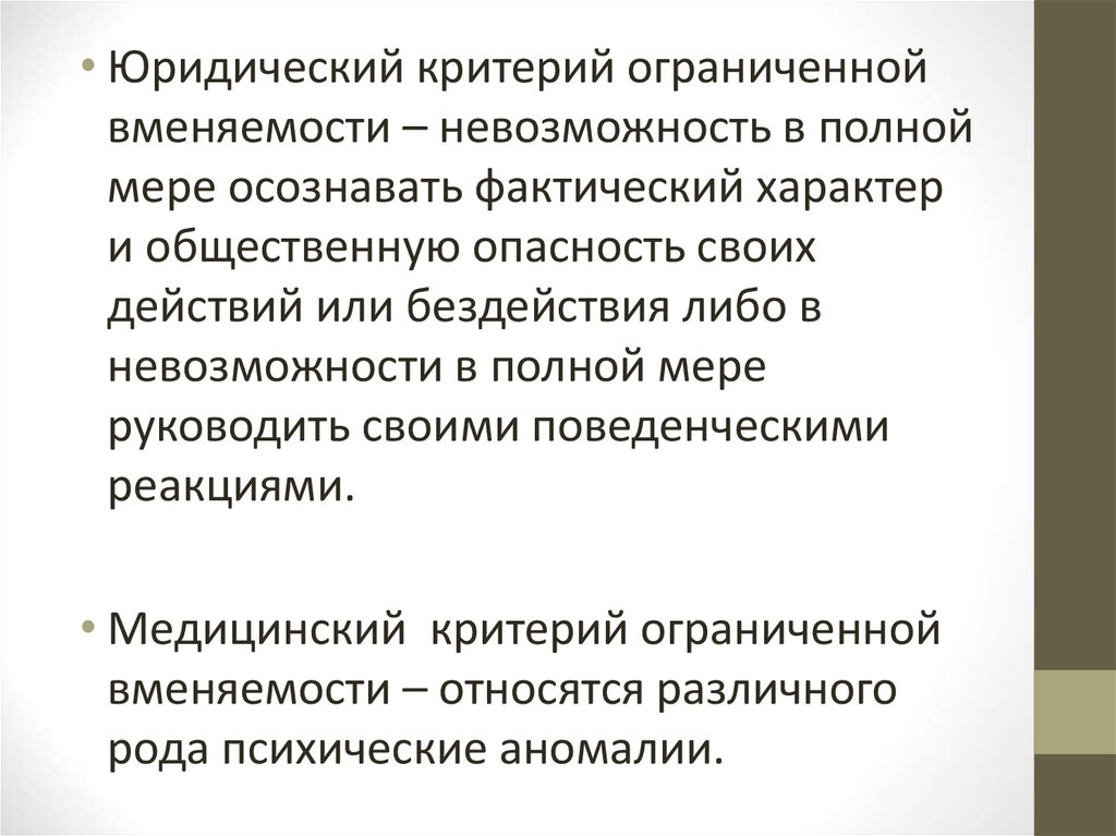 • Юридический критерий ограниченнойвменяемости – невозможность в полной