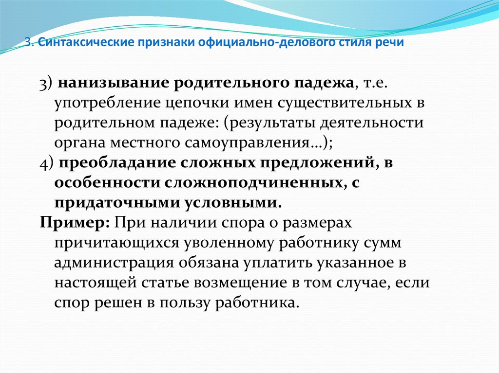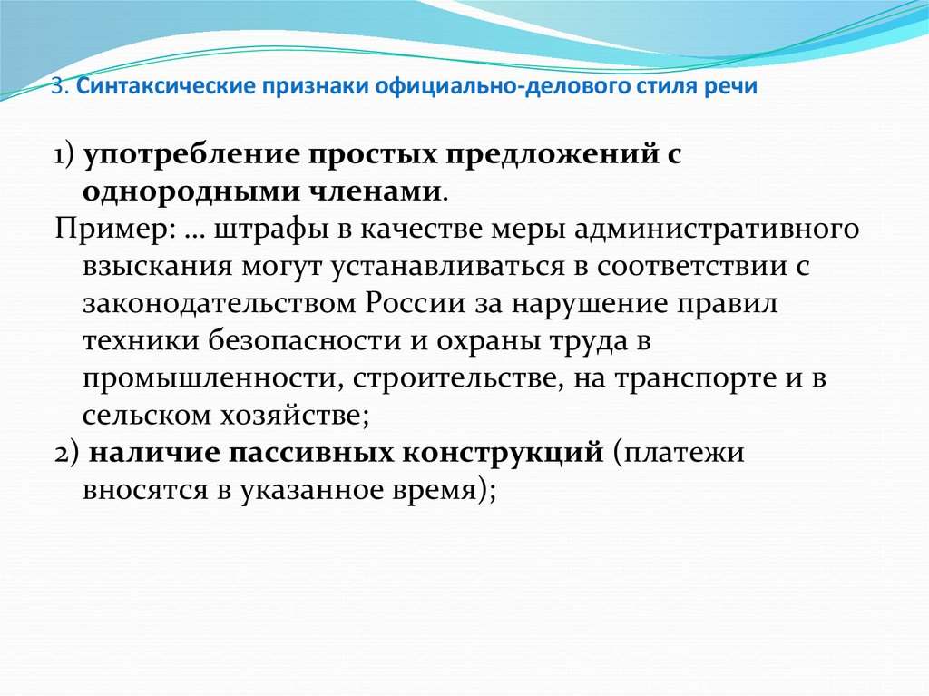 3. Синтаксические признаки официально-делового стиля речи1) употребление простых предложений с