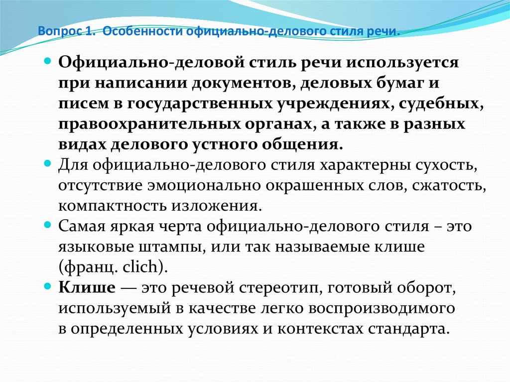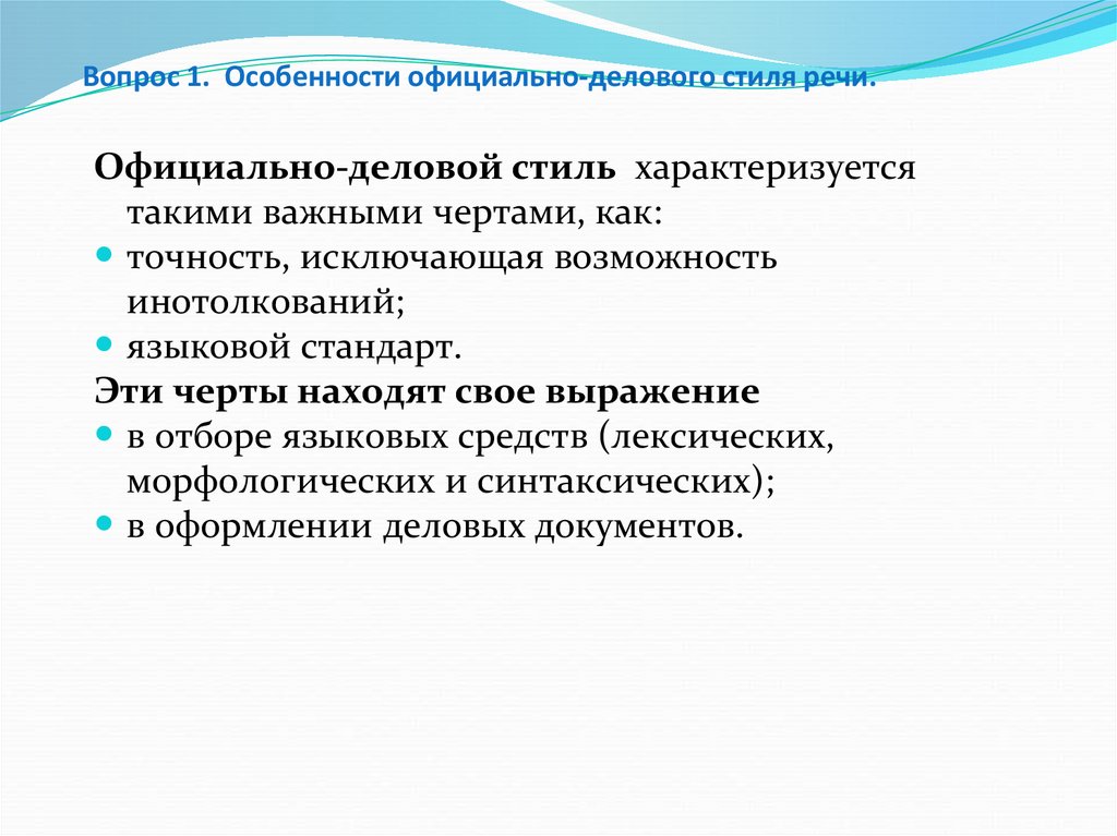 Вопрос 1. Особенности официально-делового стиля речи.Официально-деловой стиль характеризуется