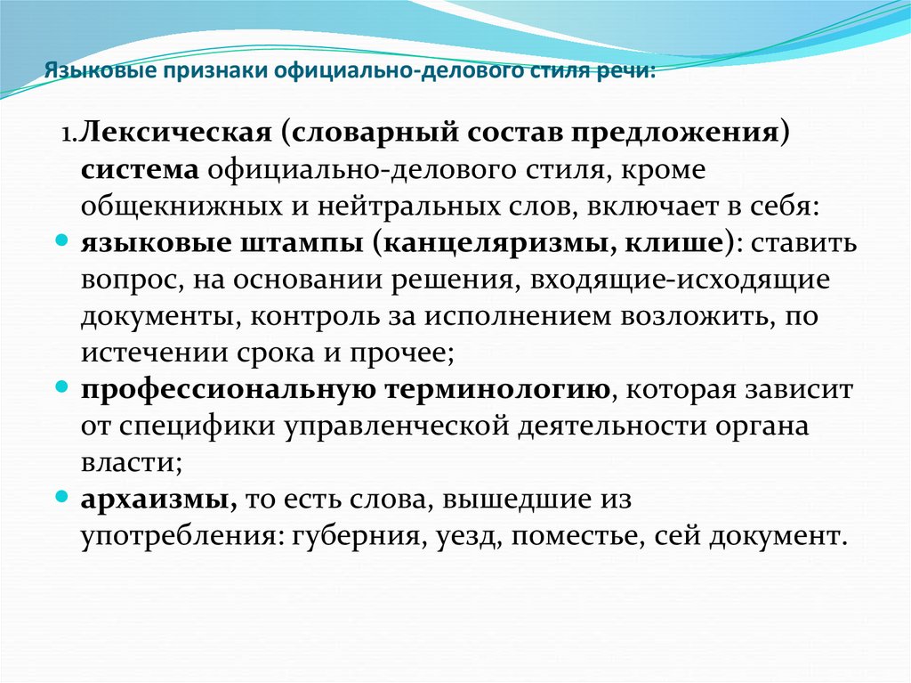 Языковые признаки официально-делового стиля речи:1.Лексическая (словарный состав предложения)