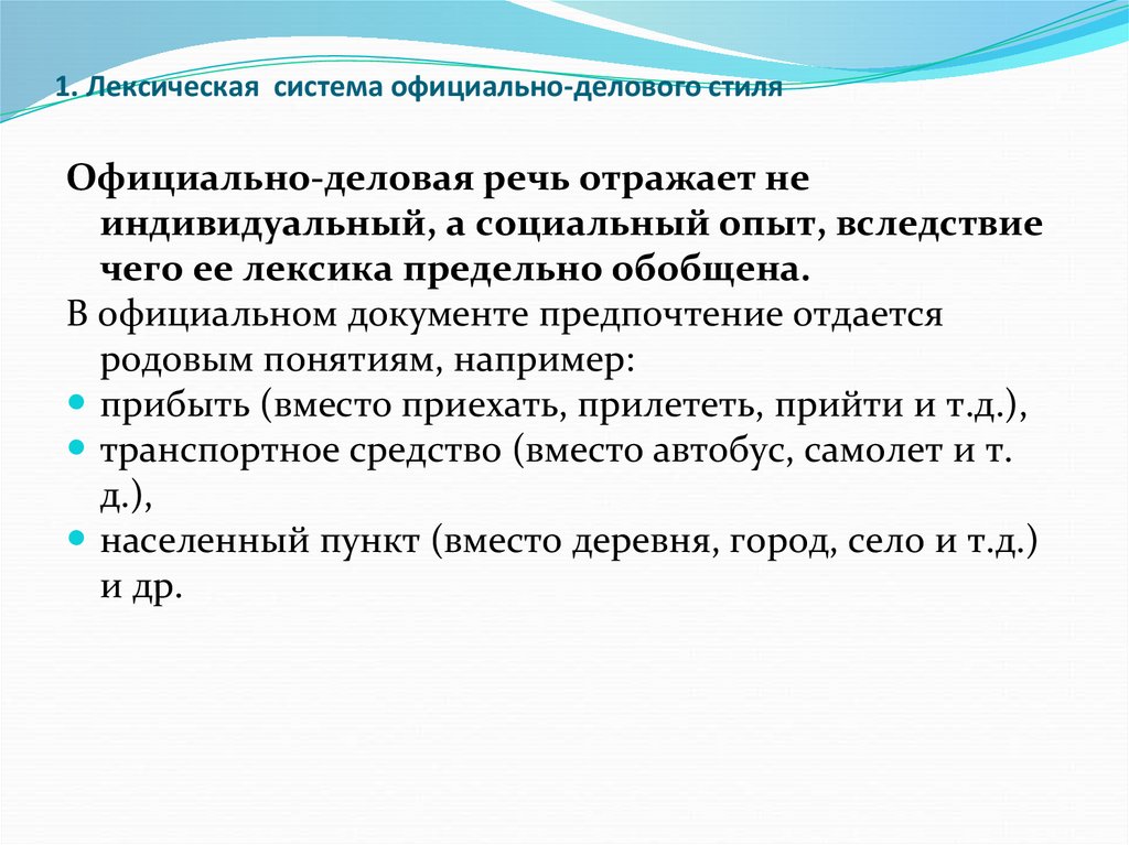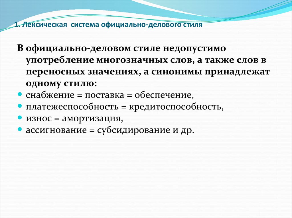 1. Лексическая система официально-делового стиляОфициально-деловая речь отражает не