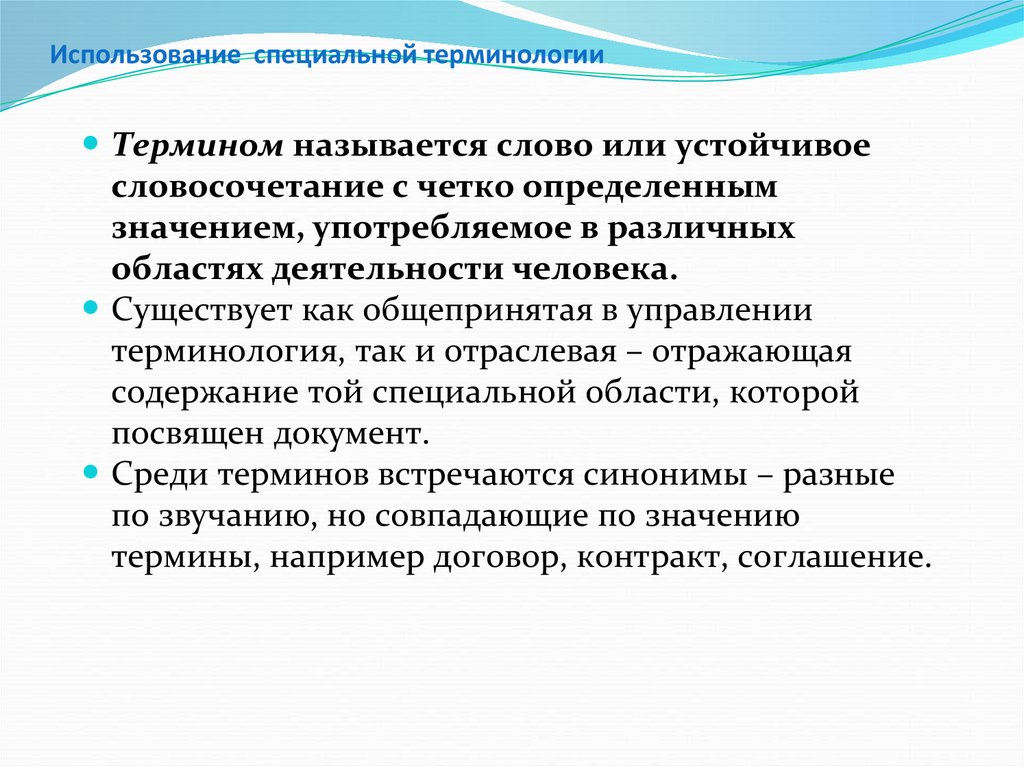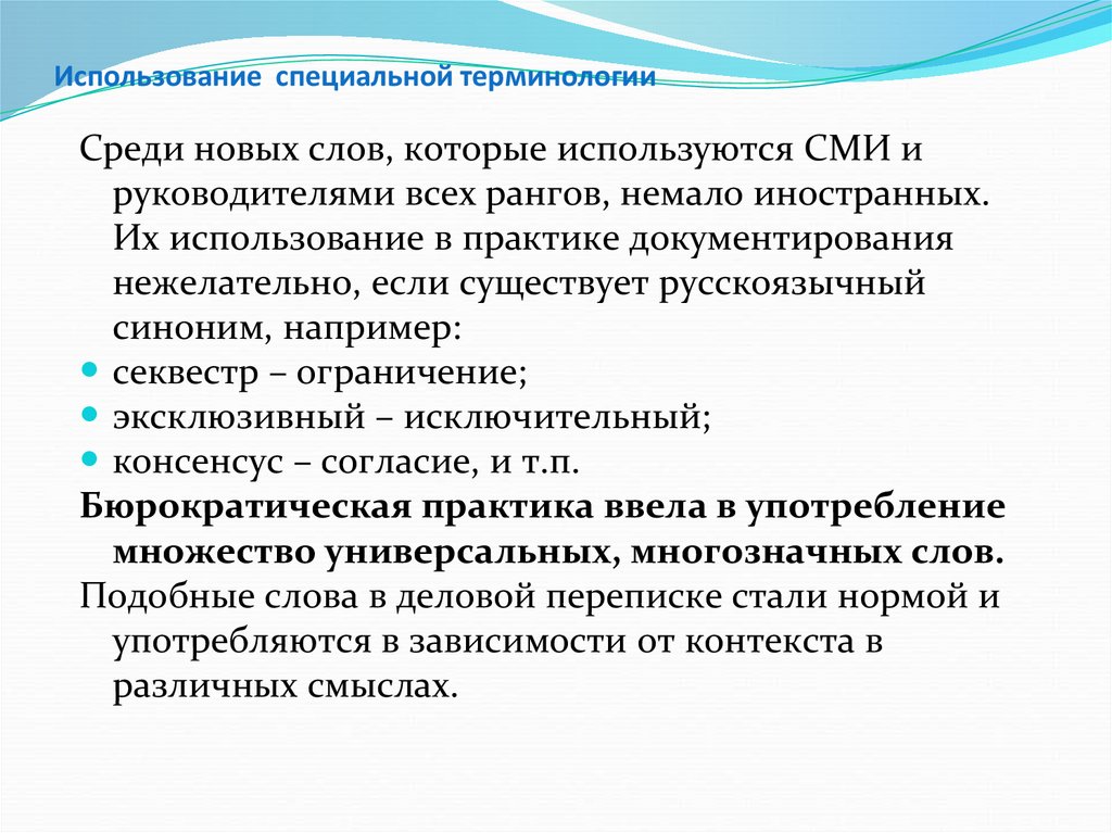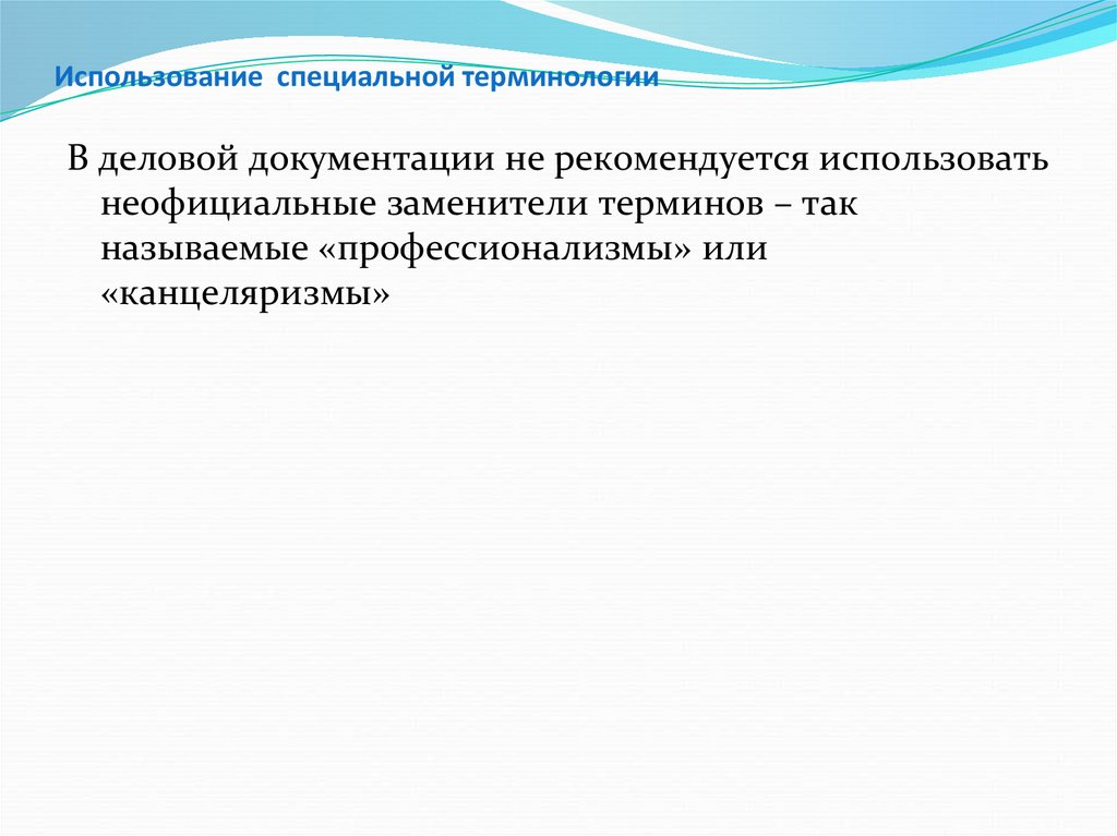 Использование специальной терминологииВ деловой документации не рекомендуется использовать