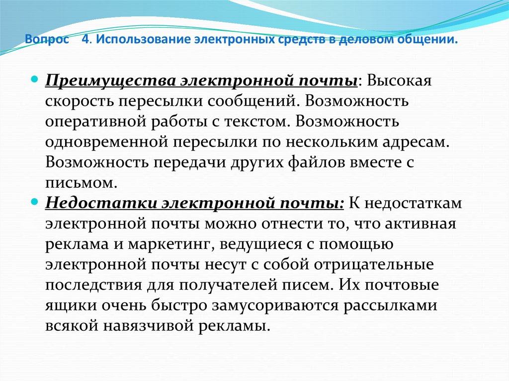 Вопрос 4. Использование электронных средств в деловом общении.Преимущества электронной почты: Высокая