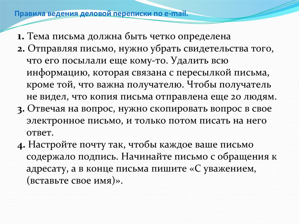 Правила ведения деловой переписки по e-mail.1. Тема письма должна быть четко определена