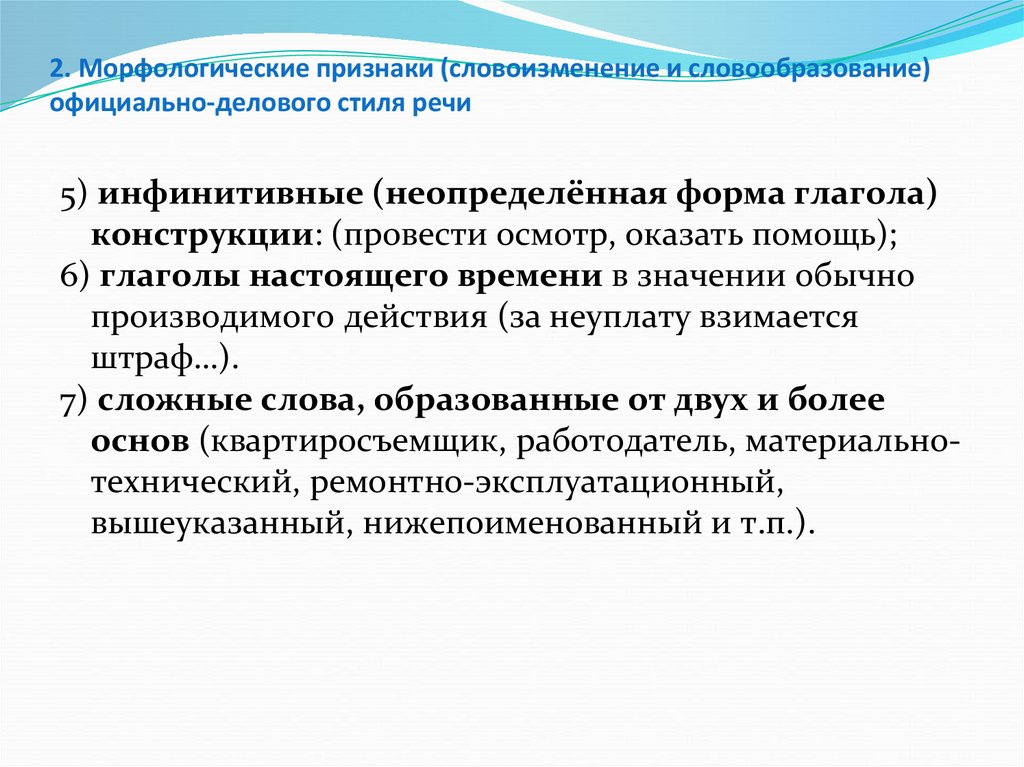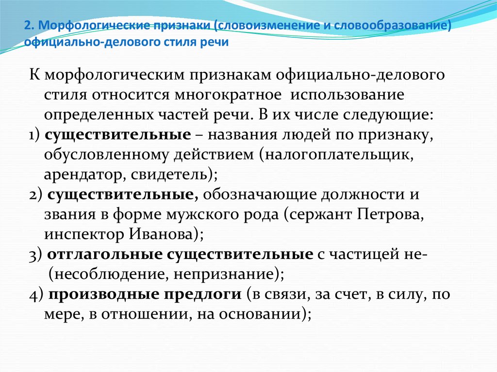 2. Морфологические признаки (словоизменение и словообразование)официально-делового стиля речи