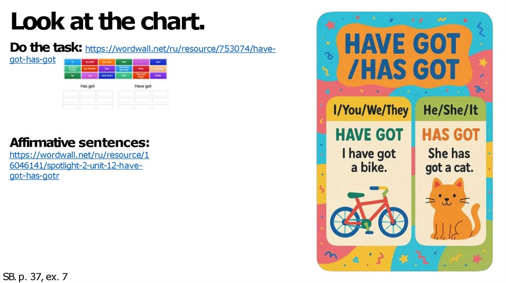 Look at the chart.Do the task: https://wordwall.net/ru/resource/753074/havegot-has-got