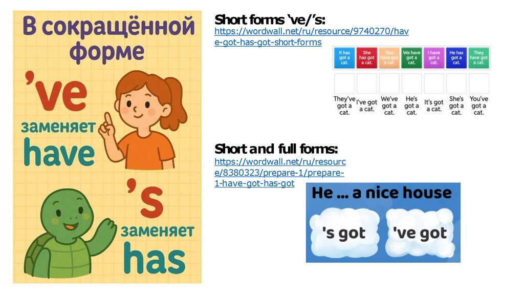 Short forms ‘ve/’s:https://wordwall.net/ru/resource/9740270/hav
