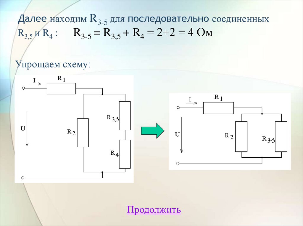Сначала находим сопротивление для R3 и R5, которыесоединены параллельно: