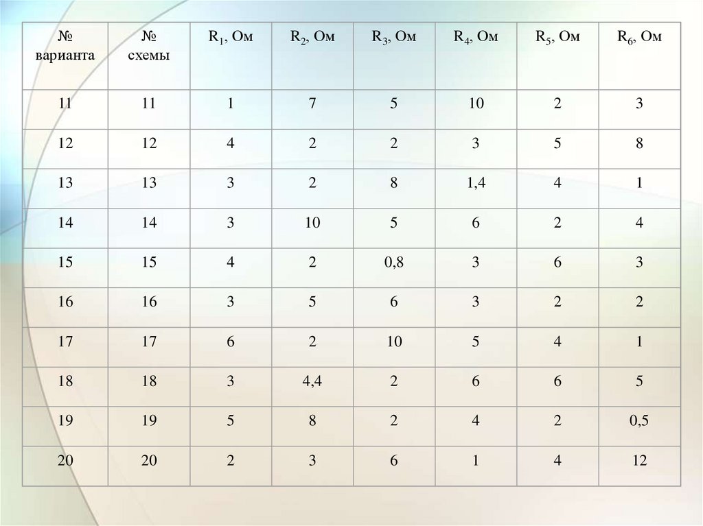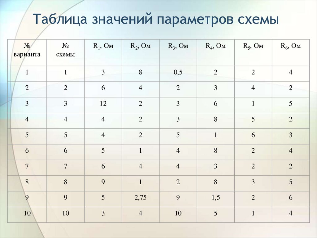 Таблица значений параметров схемы№