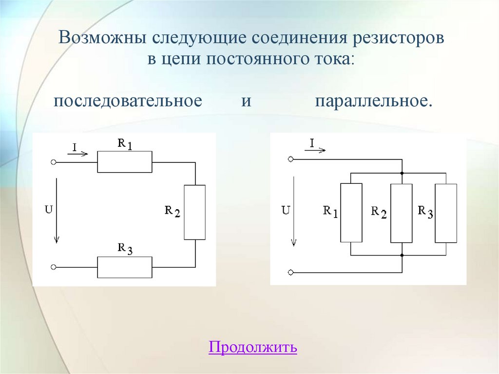 Возможны следующие соединения резисторовв цепи постоянного тока: