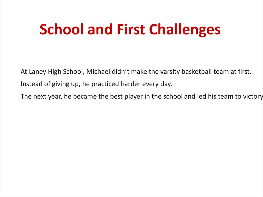 School and First ChallengesAt Laney High School, Michael didn’t make the varsity basketball team at first.