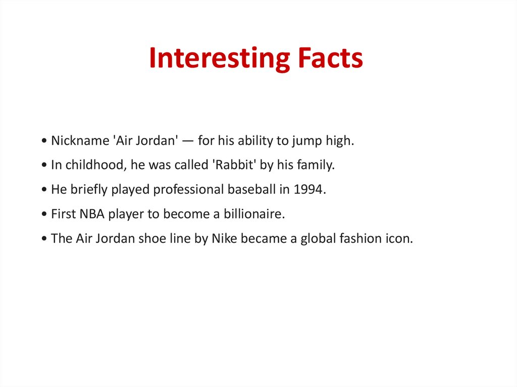 Interesting Facts• Nickname 'Air Jordan' — for his ability to jump high.