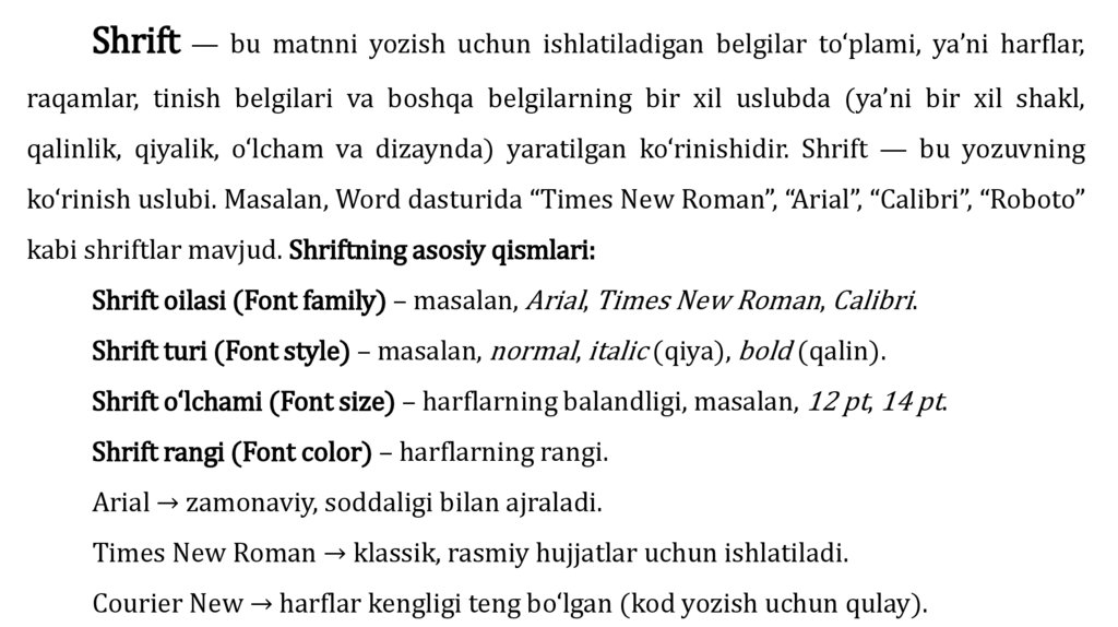 ko‘rinish uslubi. Masalan, Word dasturida “Times New Roman”, “Arial”, “Calibri”, “Roboto”