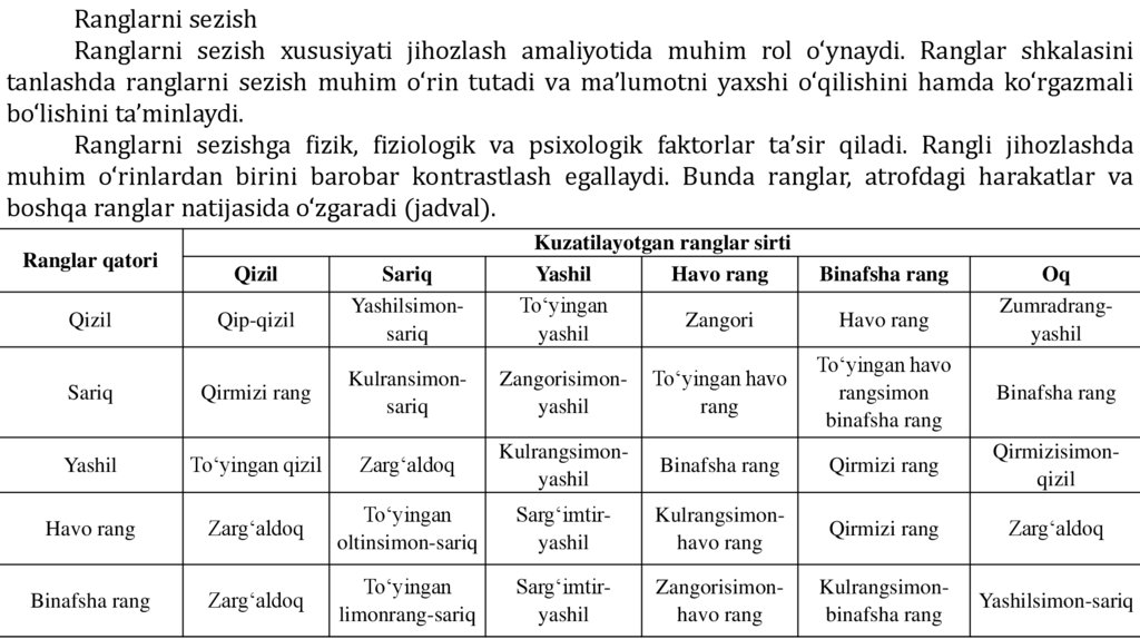 Ranglarni sezishRanglarni sezish xususiyati jihozlash amaliyotida muhim rol o‘ynaydi. Ranglar shkalasini