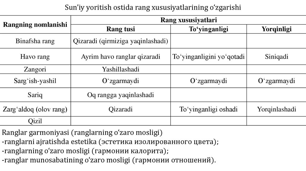 boshqa ranglar natijasida o‘zgaradi (jadval).