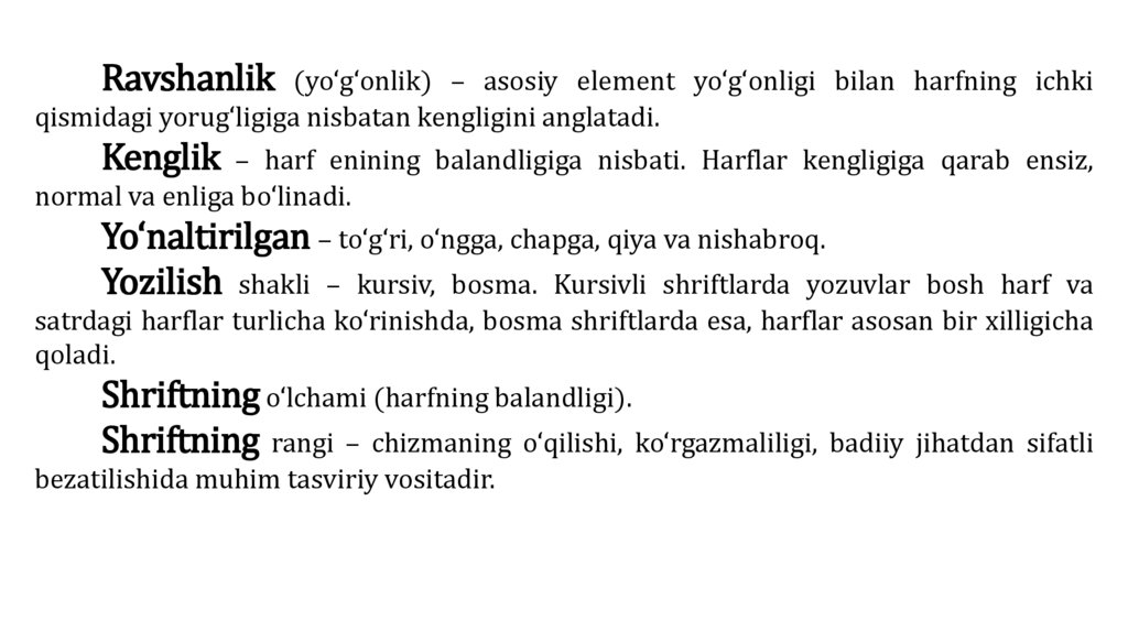 Kenglik – harf enining balandligiga nisbati. Harflar kengligiga qarab ensiz,
