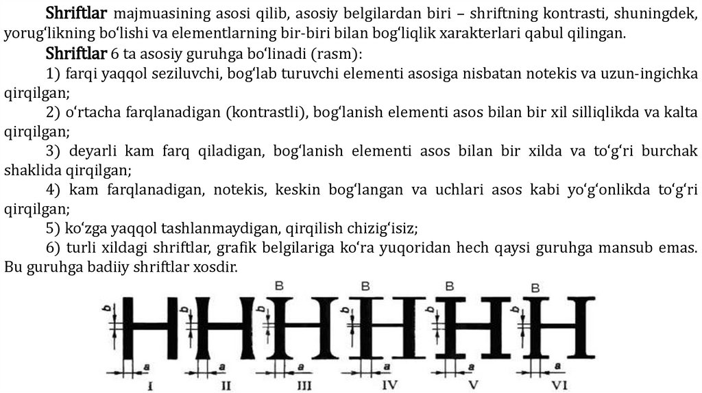 Shriftlar 6 ta asosiy guruhga bo‘linadi (rasm):