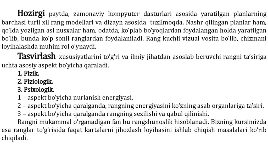 bo‘lib, bunda ko‘p sonli ranglardan foydalaniladi. Rang kuchli vizual vosita bo‘lib, chizmani