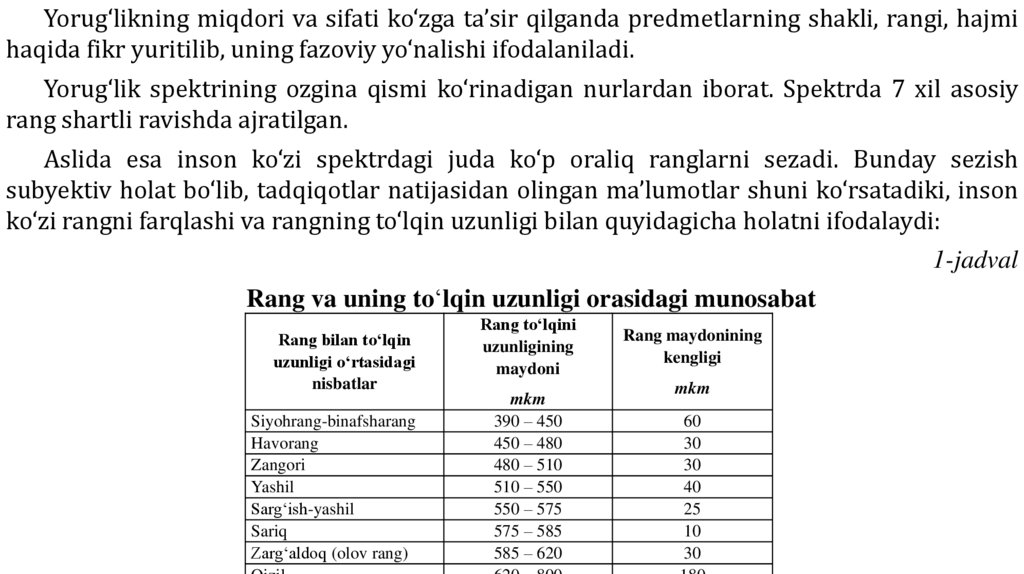ko‘zi rangni farqlashi va rangning to‘lqin uzunligi bilan quyidagicha holatni ifodalaydi:
