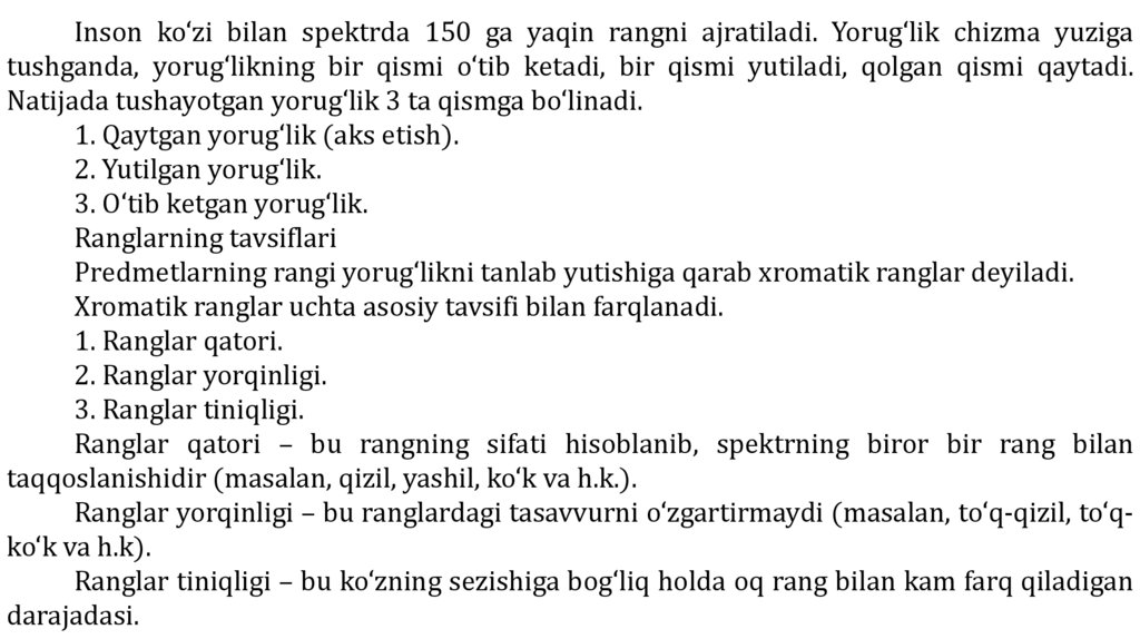 Inson ko‘zi bilan spektrda 150 ga yaqin rangni ajratiladi. Yorug‘lik chizma yuzigatushganda, yorug‘likning bir qismi o‘tib ketadi, bir qismi yutiladi, qolgan qismi qaytadi.