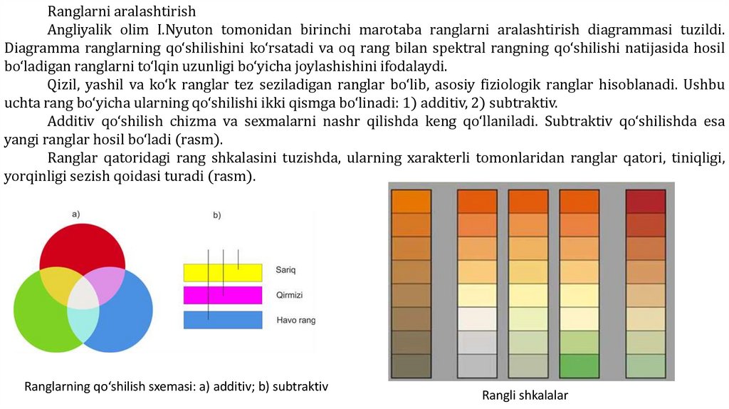 Ranglarni aralashtirishAngliyalik olim I.Nyuton tomonidan birinchi marotaba ranglarni aralashtirish diagrammasi tuzildi.