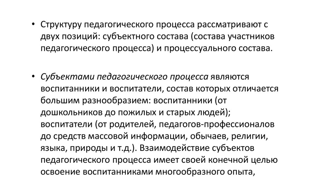 • Структуру педагогического процесса рассматривают сдвух позиций: субъектного состава (состава участников