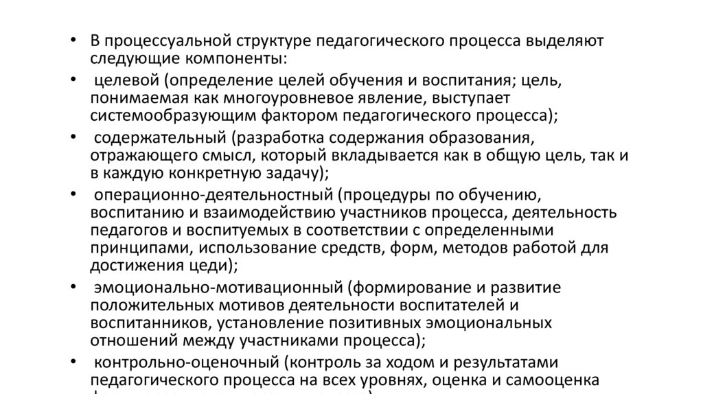 • В процессуальной структуре педагогического процесса выделяютследующие компоненты: