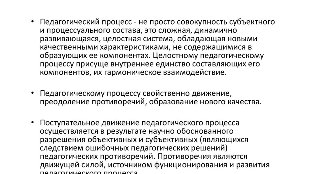 • Педагогический процесс - не просто совокупность субъектногои процессуального состава, это сложная, динамично