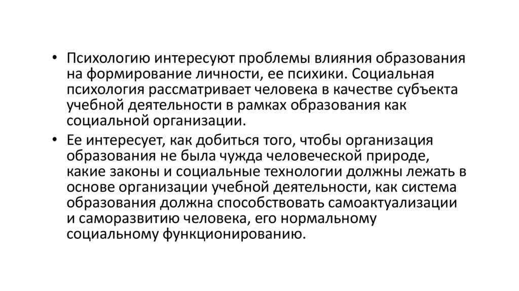 • Психологию интересуют проблемы влияния образованияна формирование личности, ее психики. Социальная