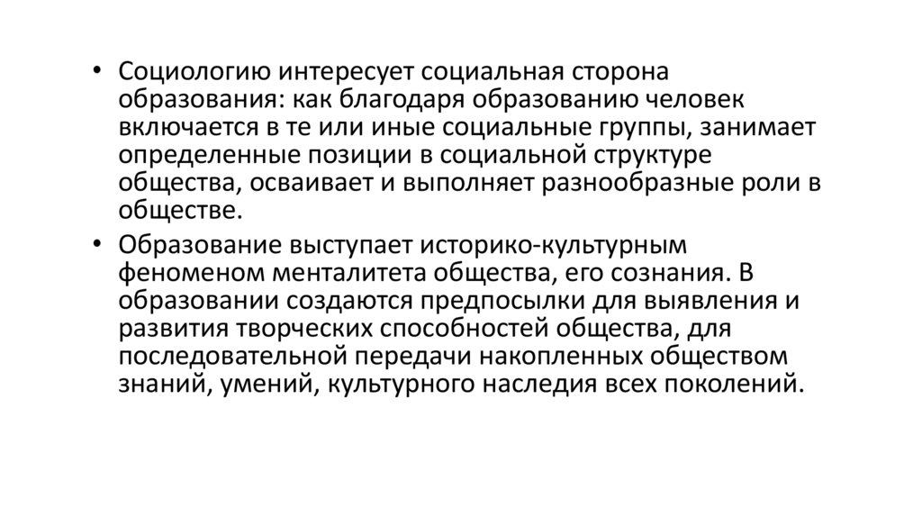 • Образование является механизмом формированиякультурной и общественной жизни, процессом трансляции