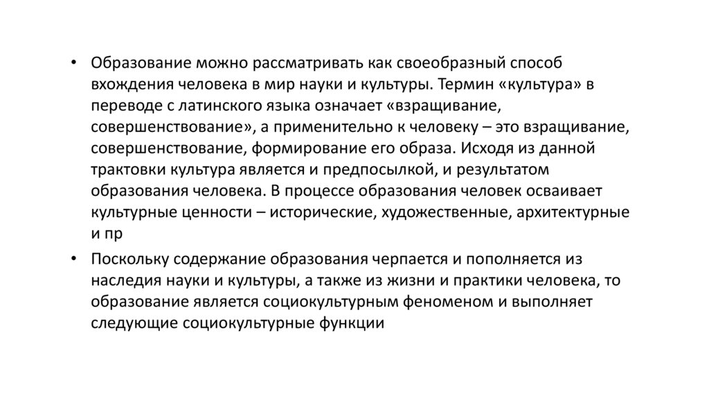 • Образование можно рассматривать как своеобразный способвхождения человека в мир науки и культуры. Термин «культура» в