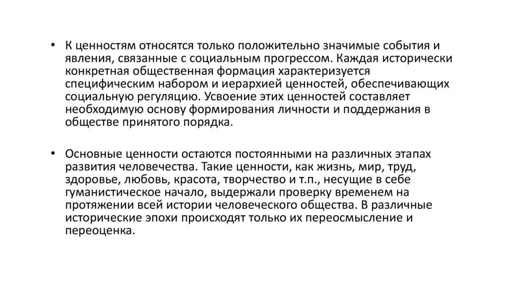 • К ценностям относятся только положительно значимые события иявления, связанные с социальным прогрессом. Каждая исторически