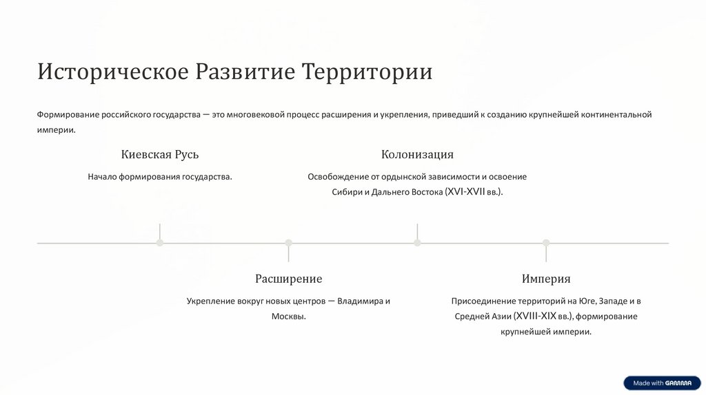Историческое Развитие ТерриторииФормирование российского государства — это многовековой процесс расширения и укрепления, приведший к созданию крупнейшей континентальной