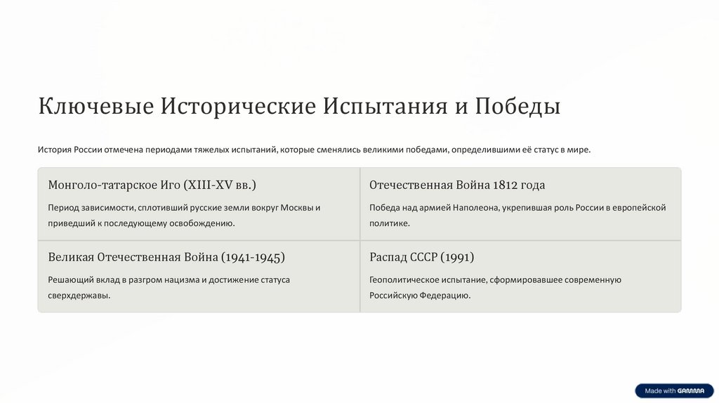 Ключевые Исторические Испытания и ПобедыИстория России отмечена периодами тяжелых испытаний, которые сменялись великими победами, определившими её статус в мире.