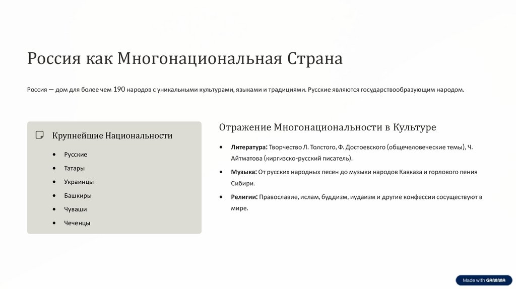 Россия как Многонациональная СтранаРоссия — дом для более чем 190 народов с уникальными культурами, языками и традициями. Русские являются государствообразующим народом.