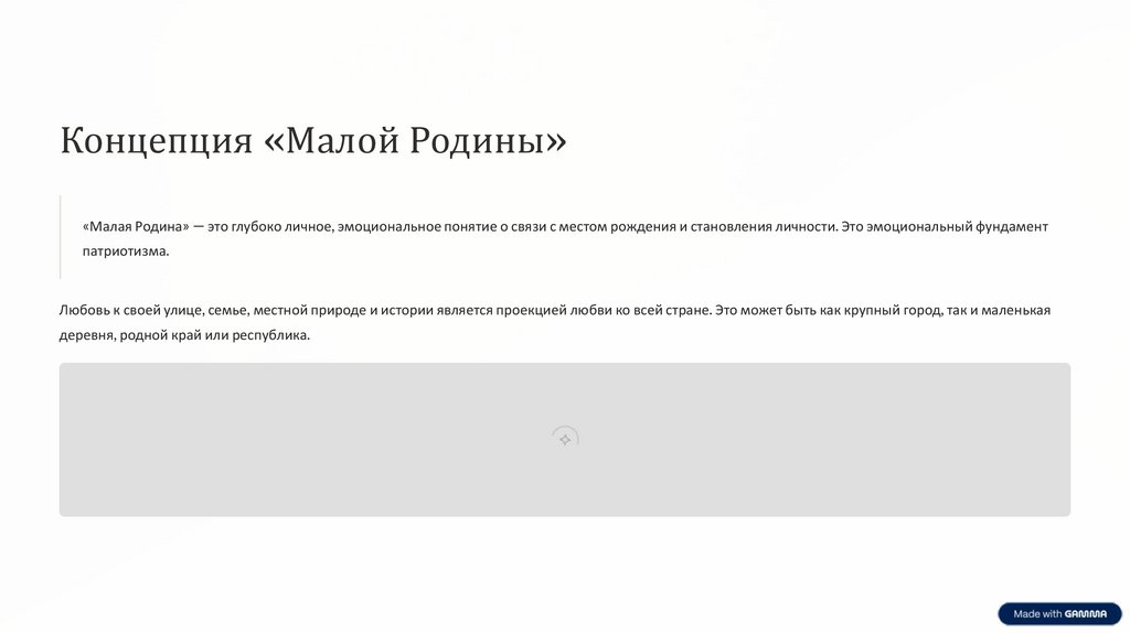 Концепция «Малой Родины»«Малая Родина» — это глубоко личное, эмоциональное понятие о связи с местом рождения и становления личности. Это эмоциональный фундамент