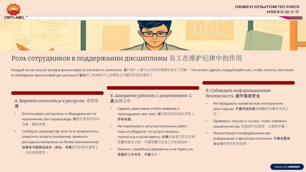 Роль сотрудников в поддержании дисциплины 员工在维护纪律中的作用Каждый из нас вносит вклад в финансовую устойчивость компании. 我们每个人都为公司的财务稳定做出了贡献。 Что может сделать каждый работник, чтобы помочь компании