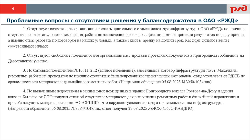 4Проблемные вопросы с отсутствием решения у балансодержателя в ОАО «РЖД»