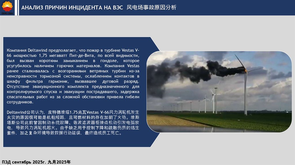 АНАЛИЗ ПРИЧИН ИНЦИДЕНТА НА ВЭС 风电场事故原因分析Компания Deltawind предполагает, что пожар в турбине Vestas V66 мощностью 1,75 мегаватт Пит-де-Вита, по всей видимости,