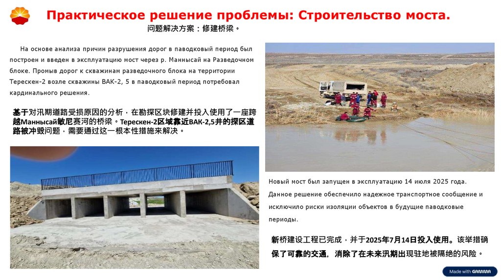 Кроме того, из за интенсивности талых вод на реке "Мыннысай" где проходит дорога ведущая к скважинам