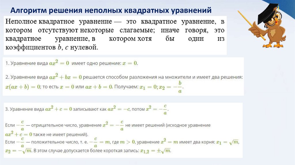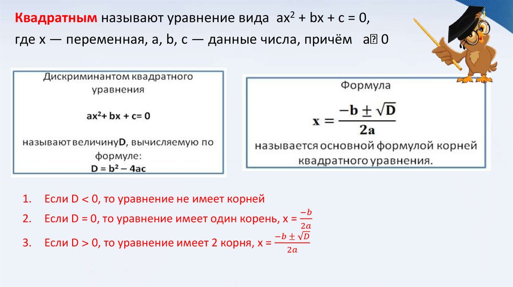 Квадратным называют уравнение вида ах2 + bх + c = 0,где х — переменная, а, b, с — данные числа, причём а 0