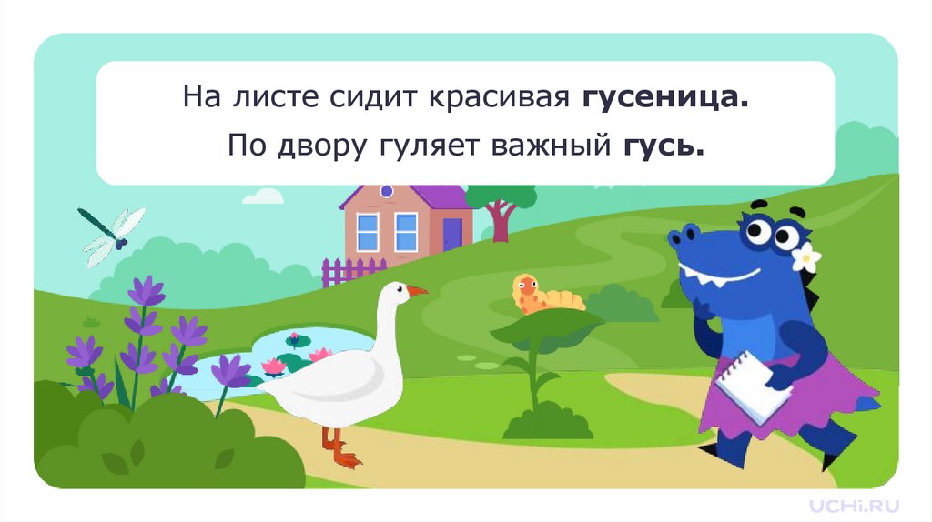 На листе сидит красивая гусеница.По двору гуляет важный гусь.
