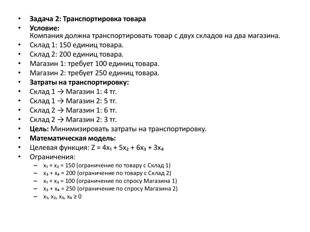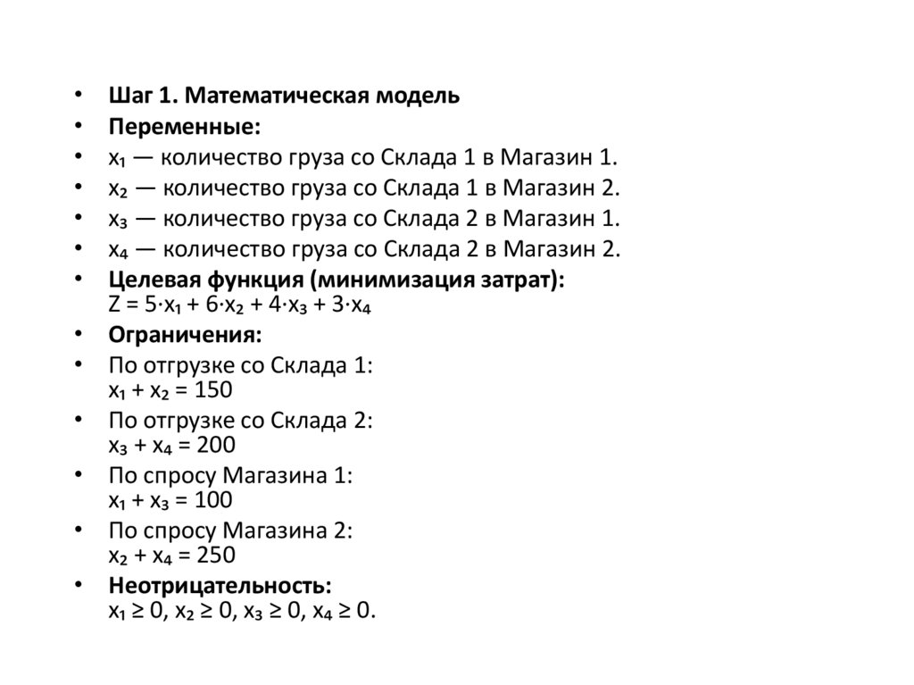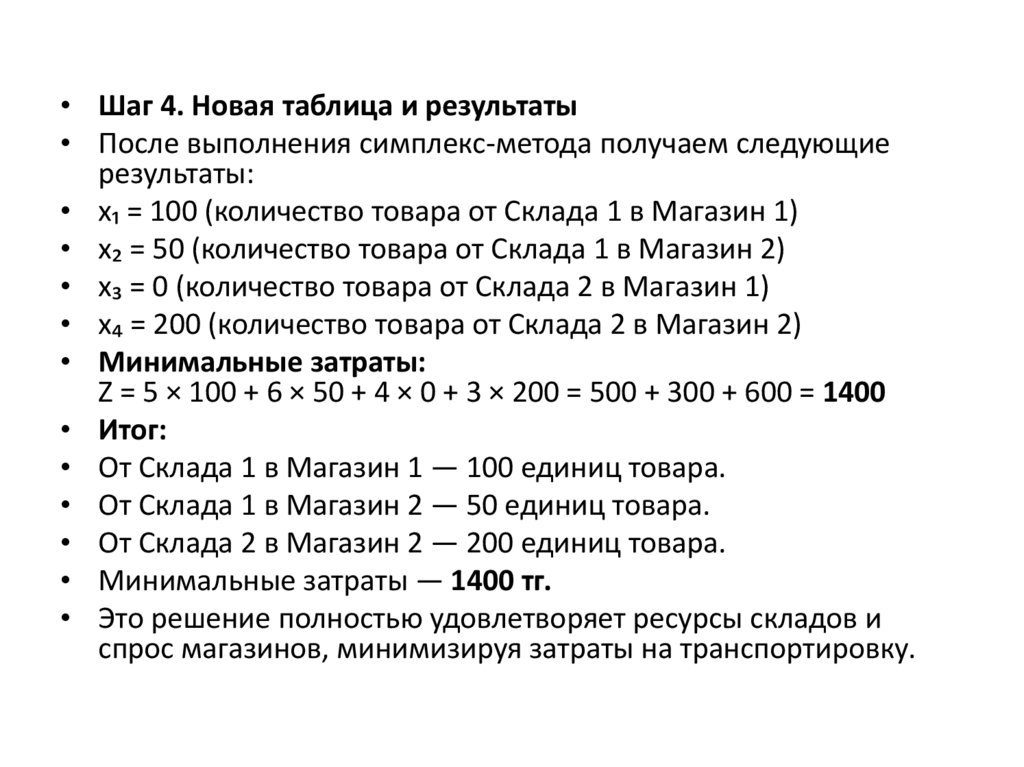 • x₄ = 200 (количество товара от Склада 2 в Магазин 2)