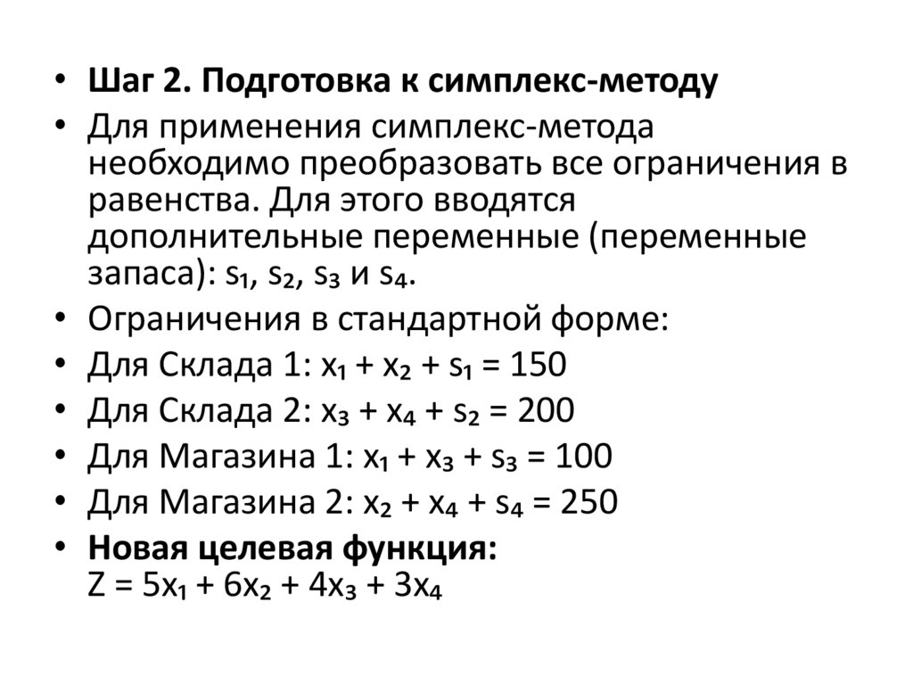 1-шаг: Приведение к стандартной формеЧтобы решить задачу симплекс-методом, сначала приводим её к стандартной форме. В стандартной форме правые части ограничений должны быть неотрицательными, а сами ограничения — з