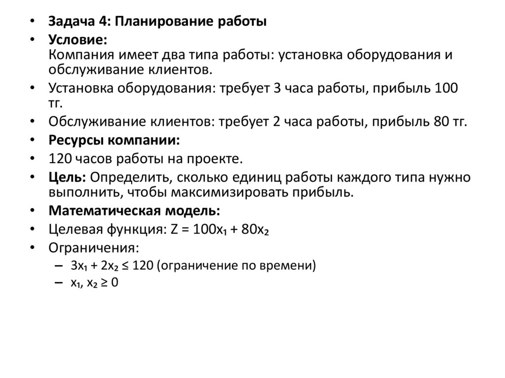 • Обслуживание клиентов: требует 2 часа работы, прибыль 80 тг.