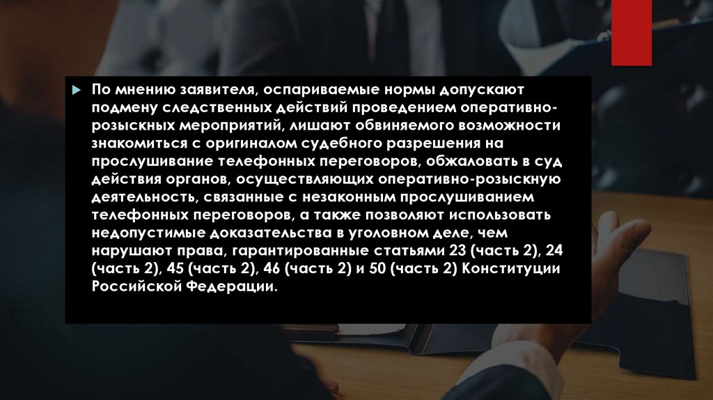 По мнению заявителя, оспариваемые нормы допускаютподмену следственных действий проведением оперативнорозыскных мероприятий, лишают обвиняемого возможности