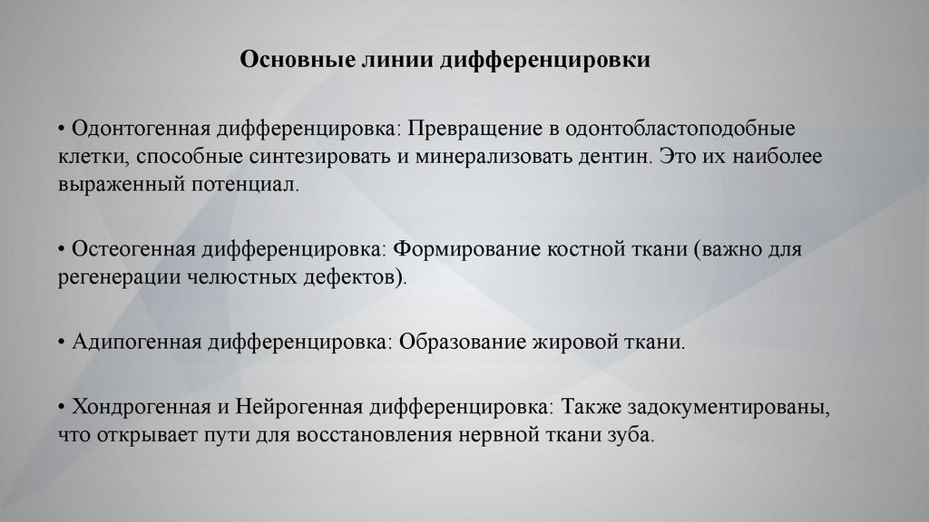 Основные линии дифференцировки• Одонтогенная дифференцировка: Превращение в одонтобластоподобные
