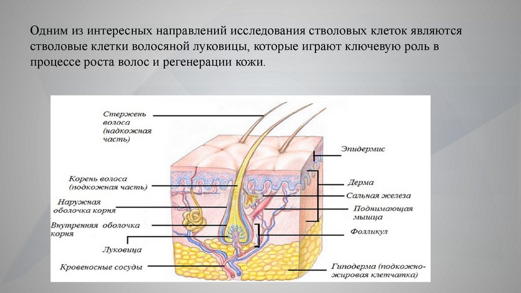 Одним из интересных направлений исследования стволовых клеток являютсястволовые клетки волосяной луковицы, которые играют ключевую роль в